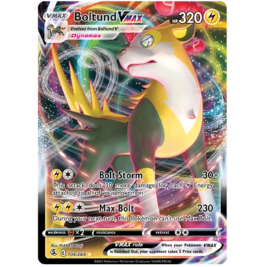 Introducing the powerful 104/264 Boltund VMAX card, a must-have for any Pokémon TCG player looking to amp up their deck! This Lightning-type Pokémon features electrifying attacks and impressive HP to dominate your opponents. With its VMAX form, Boltund reaches new heights of strength and speed on the battlefield. Add this dynamic card to your collection and shock your rivals into submission! Get your hands on the Boltund VMAX card today at De Spelvogel and electrify