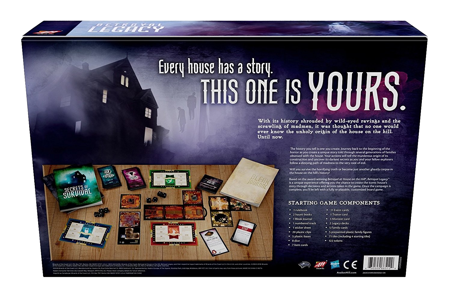 Betrayal Legacy consists of a prologue and a thirteen-chapter story that takes place over decades. Players represent families, with specific members of a family participating in one story, then perhaps an older version of those characters (assuming they lived) or their descendants showing up in later stories.