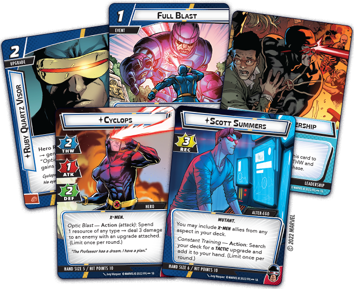 See where this is going? Tactic upgrades like Exploit Weakness (Cyclops, 5), Practiced Defense (Cyclops, 6), and Priority Target (Cyclops, 7) all attach to enemies, letting you mark a target for your Optic Blasts while also providing effects for your allies and fellow heroes to take advantage of. Use your position as Field Commander (Cyclops, 4) to ensure that you attach a Tactic upgrade to an enemy before anyone else takes their turn, especially since the “temporary” keyword makes the upgrades discard themselves at the end of the round. Enhance your Optic Blasts with your Ruby Quartz Visor (Cyclops, 3), then devastate a target with a Full Blast (Cyclops, 8). If you find yourself running low on Tactic upgrades, then turn to your Tactical Brilliance (Cyclops, 10) to pull one out of your discard pile and keep your momentum going.