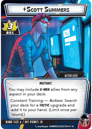 Right off the bat, Scott Summers (Cyclops, 1A) can include X-Men allies from any aspect in his deck. It doesn’t matter what aspect you choose to play with; you can always take your favorite X-Men allies with you against any foe. Aside from that, Scott’s Constant Training lets him search his deck for a Tactic upgrade, which plays off the ability of his hero form. As Cyclops (Cyclops, 1B), he is armed with a powerful Optic Blast, which lets him deal 3 damage to an enemy with an upgrade attached to it once per round.
