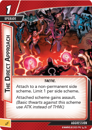 Speaking of aggressive streak, X-23’s pre-built deck provides even more ways for you to overwhelm the enemy. Have Boom Boom (X-23, 13) charge up a massive blast while Rictor (X-23, 14) helps you keep the villain’s minions in check. Between her claws and her Claw Mastery, X-23 can reach 5 ATK from her signature kit alone; add in the “Now I’m Mad” (X-23, 19) upgrade, and she can push it even higher. With such sky-high ATK, she can take full advantage of Moment of Triumph (X-23, 17) and carve huge chunks of threat off schemes with the new “assault” keyword, such as the player side scheme Keep Them Busy (X-23, 18) or any scheme with The Direct Approach (X-23, 20) attached.