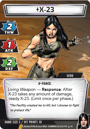 Where Wolverine used his hit points as a resource for playing attacks, X-23’s Living Weapon ability turns her hit points into a source of momentum. With the ability to ready after taking any amount of damage—from any source—once per phase, X-23 is all about using multiple actions in a round to overwhelm the villain with sheer force. Thwart with X-23’s respectable THW of 2, then use her claws to damage (and thus ready) her and grant her an ATK buff for the rest of the round. Slash the villain with her boosted ATK, then follow up with Honey Badger (X-23, 3) and ready X-23 again to keep the momentum going.