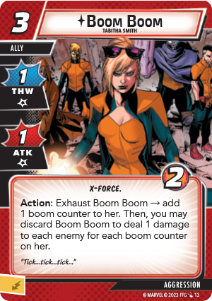 Even without Honey Badger, X-23 is still a force to be reckoned with. Her Pain Tolerance (X-23, 11) can keep her healthy while her Grim Resolve (X-23, 10), can give her a steady flow of resources (and potentially readies)! If an enemy’s causing trouble, inflict them with a Puncture Wound (X-23, 12) or two and keep the aggressive streak going.