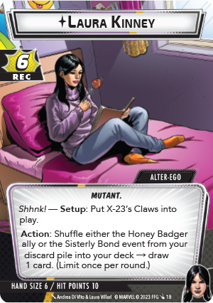 Speaking of Honey Badger, X-23’s adopted sister forms a core part of her kit. Her Claw Mastery (X-23, 5) provides additional benefits while Honey Badger is in play, and Regenerative Longevity (X-23, 6) can ensure both Laura and Gabby stay in the fight for as long as possible. Use Sisterly Bond (X-23, 7) to boost Honey Badger’s stats, and then, when she inevitably ends up in your discard pile, call on the power of Sisterhood (X-23, 8) to bring her right back.