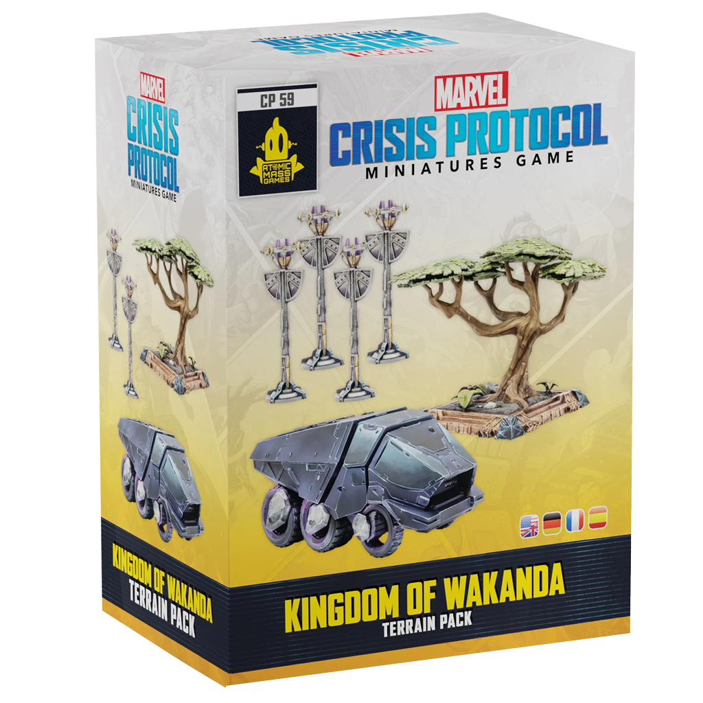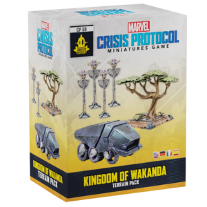 The Kingdom of Wakanda comes to the tabletop in this new terrain pack for Marvel: Crisis Protocol! Featuring a variety of terrain pieces from this technologically advanced nation, including lamps, a tree, and a vibranium transport, this pack allows players to customize their own Wakandan battlefields. Along with these terrain pieces, players will also find a new One-Shot card that invites them to modify their Crisis into a unique scenario focusing on the terrain they find in this pack.