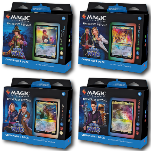 This Universes Beyond collection includes four preconstructed Commander decks, each inspired by different eras, characters, and mechanics from the Doctor Who franchise. Whether you prefer time travel, villainous schemes, or legendary Time Lords, this set has a deck for every kind of player.