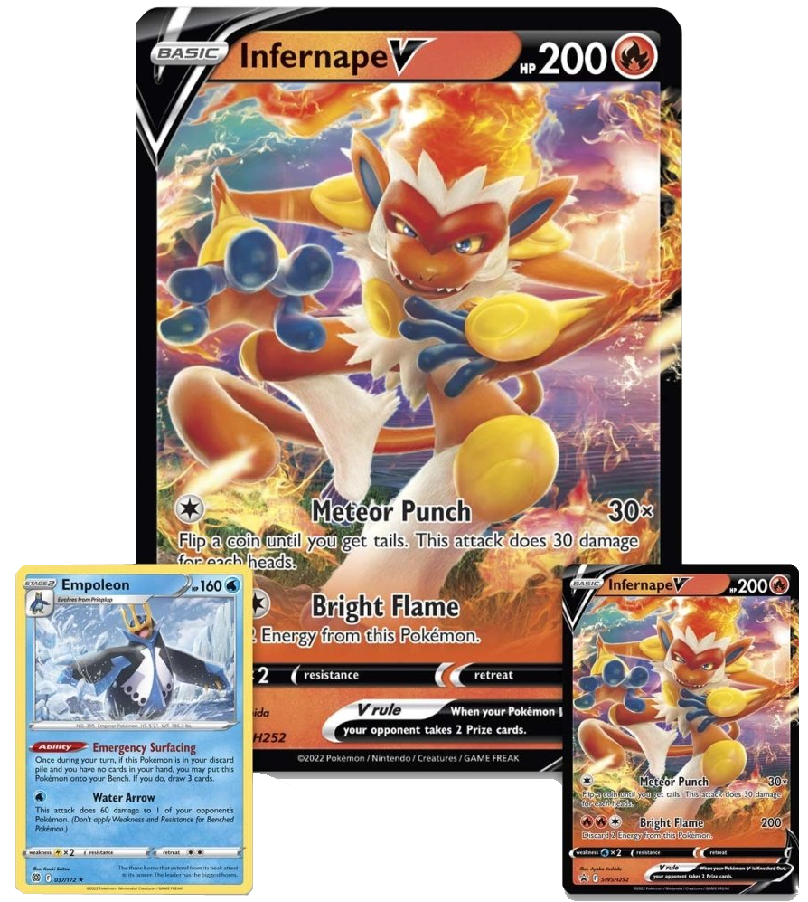 In deze doos vind je speelbare en extra grote versies van Infernape V, plus een speelbare bonuskaart met Empoleon. Je krijgt ook een handvol Pokémon TCG-boosterpakketten om je decks te verbeteren en te vullen uit je collectie.