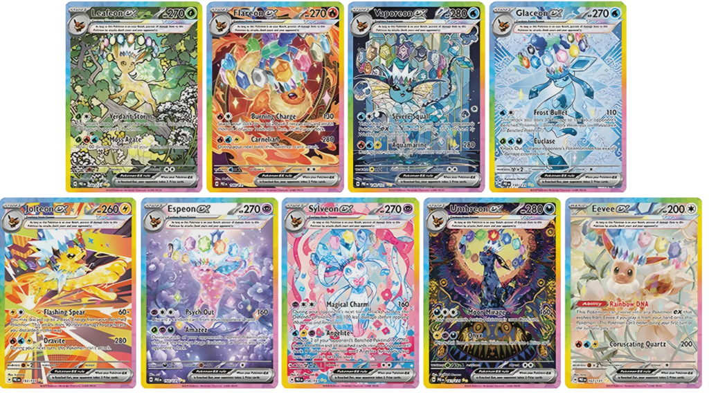 Scarlet & Violet—Prismatic Evolutions Tech Sticker Collection (available Jan. 17, 2025): Includes three Scarlet & Violet—Prismatic Evolutions booster packs; one foil promo card featuring Leafeon, Glaceon or Sylveon; and one sticker sheet for personalizing laptops, tablets and other tech devices.
