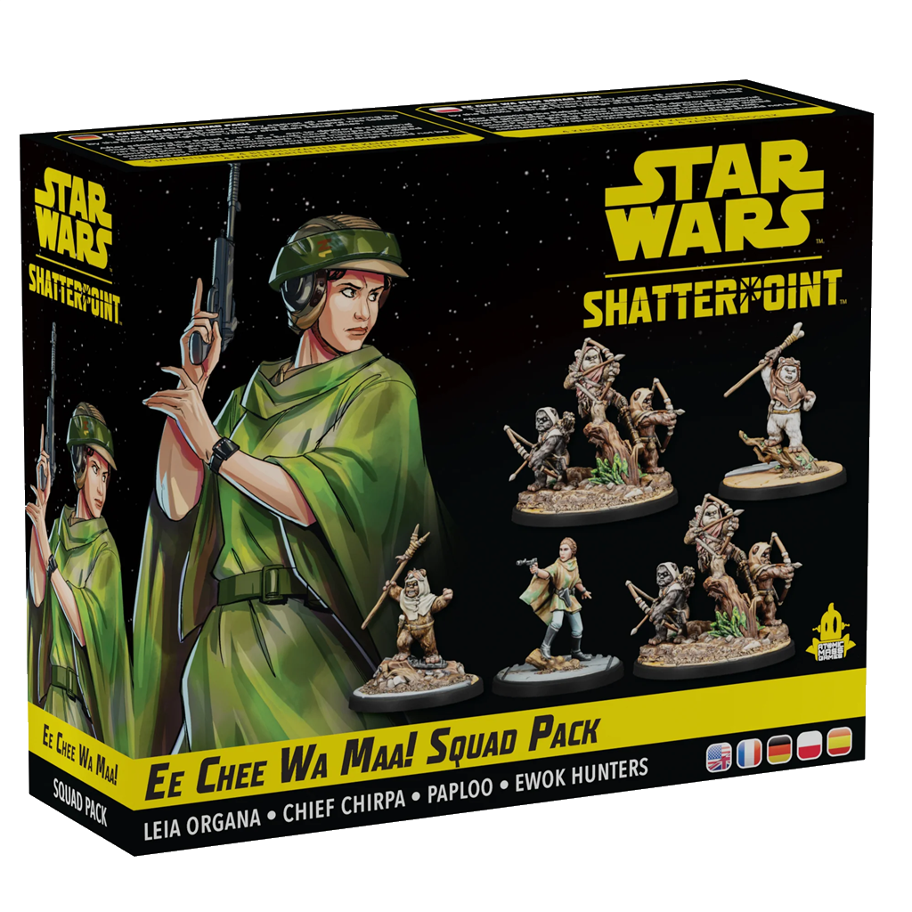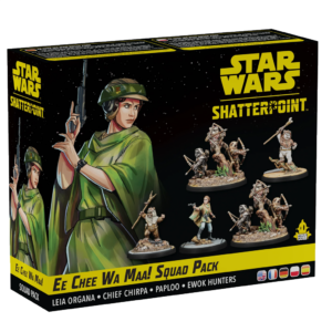 An iconic Rebel and her Ewok companions join Star Wars™: Shatterpoint in this new Squad Pack! Featuring both Leia Organa and Chief Chirpa as Primary Units, the Ewok Paploo as a Secondary Unit, and two Ewok Hunters wielding bows as Supporting Units, this pack gives players a variety of new options for creating Galactic Civil War-era squads. In addition to beautifully sculpted miniatures of these characters, this pack also includes all the Stat, Order, and Stance Cards players need to field them in battle.