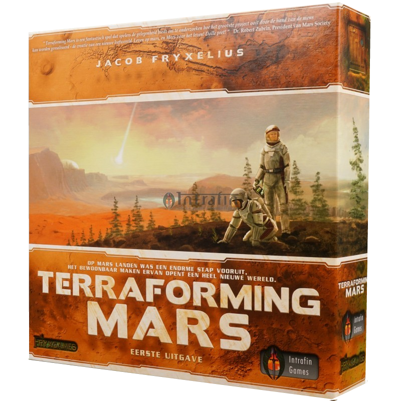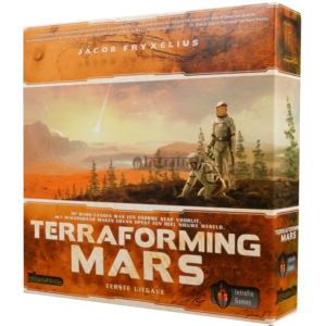 HET TEMMEN VAN DE RODE PLANEET IS BEGONNEN! Verschillende corporaties gaan de concurrentie aan om van Mars een bewoonbare planeet te maken. Ze gebruiken een gigantisch aantal middelen en innovatieve technologieën om de temperatuur te verhogen en een leefbare atmosfeer en oceanen te creëren. Naargelang het terraform proces vordert, zullen steeds meer mensen de Aarde verlaten om zich op de Rode Planeet te vestigen. In Terraforming Mars sta je aan het hoofd van een corporatie met een eigen specialisatie en doelen. Speel projectkaarten, vergroot je productie, plaats je steden en groene zones op de kaart en streef naar mijlpalen en onderscheidingen! Zal jouw corporatie de weg wijzen naar een nieuw tijdperk in de geschiedenis van de mensheid? Voor winkels: – koop er 6 krijg een korting van 5% – koop er 12 krijg een korting van 5% en een demo exemplaar (1x per fysieke winkel, niet online) – kortingen zijn niet cumulatief met andere kortingen of promoties Winnaar van de l’As d’or Expert 2018 Winnaar van de Deutscher SpielePreis2017 Winnaar van de Diana Jones Award for Excellence 2017 Winnaar van de Cardboard Republic Architect Laurel 2016