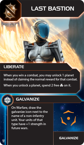 The Bastion’s resourcefulness is certainly one of their greatest strengths, but where they truly shine is in their ability to “galvanize” their forces. A galvanized unit rolls an additional die for all combat rolls and unit abilities, essentially doubling their effectiveness across the board. This represents Last Bastion’s indomitable spirit and, once again, their ability to get the most out of what little they have. You can galvanize a unit through the use of the Bastion’s Phoenix Standard ability or through effects like those on their mech, the A3 Valiance , and you’ll want to do so as much as possible to show the galaxy exactly why the Bastion never gave up in the face of impossible odds!