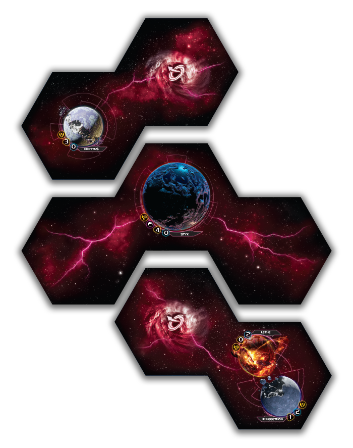 Whenever a player gains their breakthrough, they roll a die. If the result is a 1 or a 10, The Fracture enters play. The Fracture has its own set of system tiles, and they can only be accessed through “ingress tokens,” which are placed at certain spots throughout the galaxy when The Fracture enters play. Each planet within The Fracture gives you a relic when you gain control of it, and the new legendary planet Styx also gives you a victory point for as long as you have it, thanks to its ability, A Song Like Marrow . However, you won’t be able to just waltz in and take these planets for yourself—after all, this alternate space is already occupied!