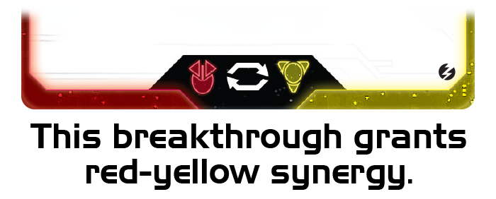 Speaking of breaking open possibilities, let’s talk about breakthroughs! In Thunder’s Edge, every faction in the game (including the base game and the Prophecy of Kings expansion) gains one of these special new cards that must be unlocked during gameplay. Every breakthrough has two effects: a special ability, and a “synergy” between two technology colors.